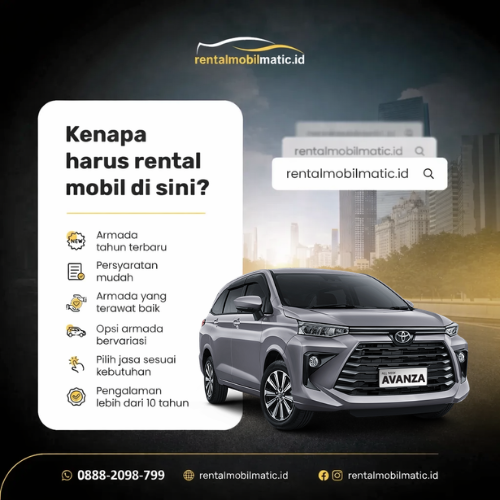 Tingkatkan efisiensi bisnis dengan menyerahkan urusan pengelolaan armada kepada ahlinya. Segera dapatkan harga sewa Avanza bulanan terdekat yang paling kompetitif dan bersahabat dengan anggaran perusahaan. Kunjungi rentalmobilmatic.id sekarang dan mari bertumbuh bersama.