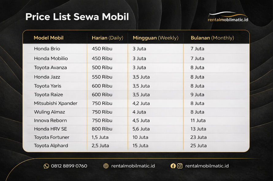 Pahami dulu harga sewanya dan pilih yang sesuai anggaran! Ini daftar harga sewa mobil bulanan di Jakarta bersama Rentalmobilmatic.id. ...